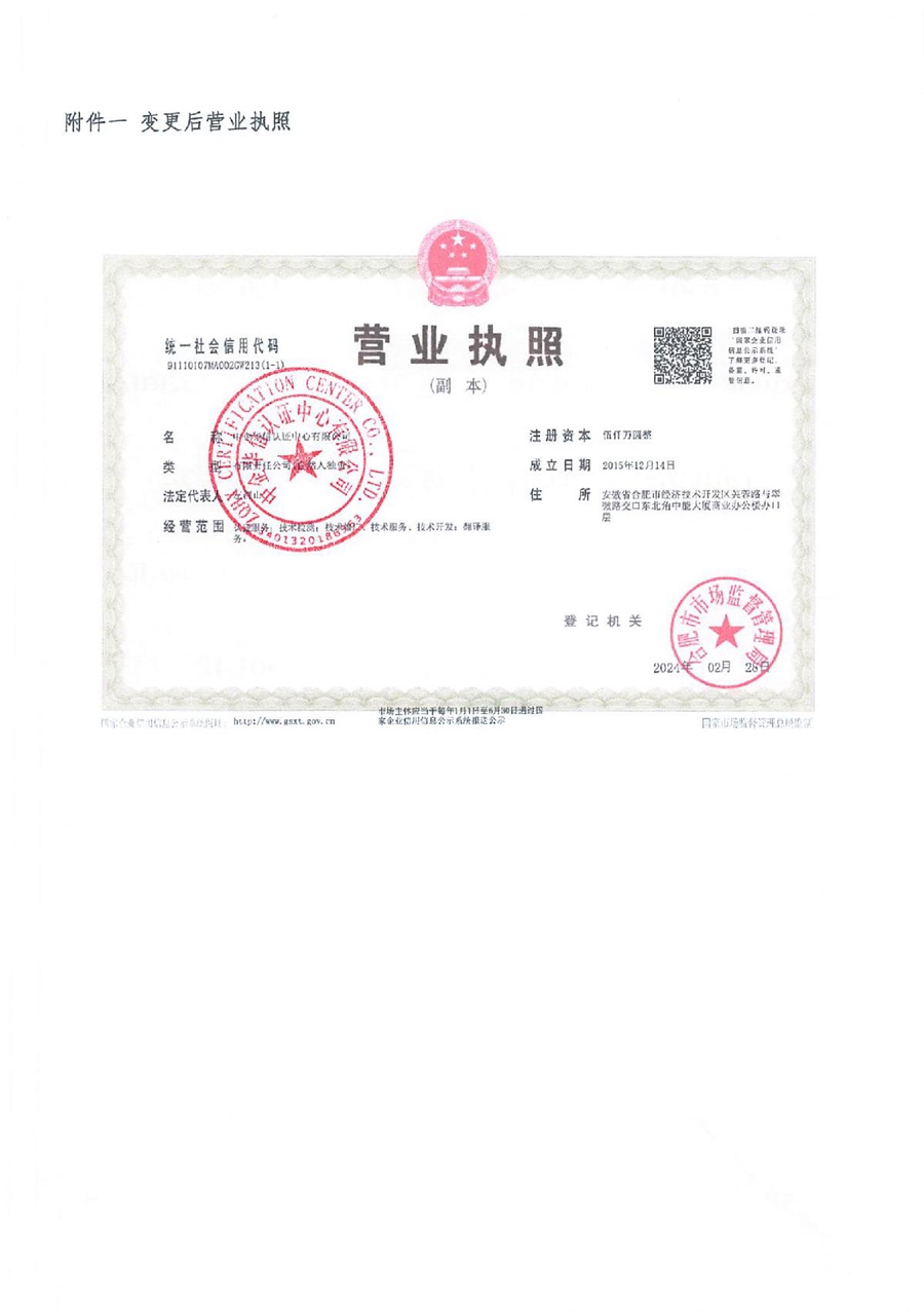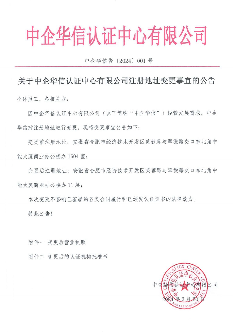 關于中企華信認證中心有限公司注冊地址變更事宜的公告